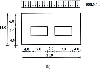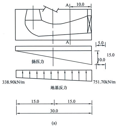 某电站厂房尾水管简图见题图,其中垂直水流向尾水管A—A横剖面见下图(a)。若A—A剖面处顶板的外荷载为400kN/m,基础扬压力图形见下图(b),混凝土重度以25kN/m3计,则A—A剖面上总的不平衡剪力最接近以下选项中的哪一项() 题图某电站厂房尾水管简图