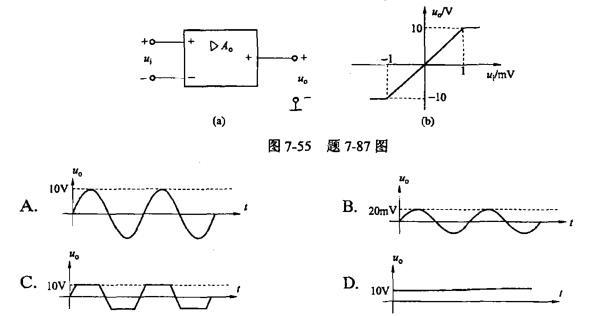 <p>图7-55(a)所示运算放大器的输出与输入之间的关系如图7-55(b)所示,若Ui=2sinωtV,则u0为()。 <i