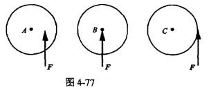 如图4-77所示三个质量、半径相同的圆盘 A、B和C,放在光滑的水平面上;同样大小和同方向的力F分别作用于三个圆盘的不同点,则惯性力分别向各自质心简化的结果是()