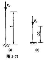 <p>一端固定,一端自由的细长(大柔度)压杆,长为L[图5-71(a)],当杆的长度减小一半时[图5-71(b)],其临界载荷F