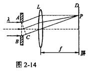 一束波长为λ的平行单色光垂直入射到一单缝AB上,装置如图2-14所示。在屏幕上D形成衍射图样,如果P是中央亮纹一侧第一个暗纹所在的位置,则的长度为(),