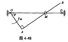 如图4-48所示直角弯杆OAB以匀角速度ω绕O轴转动,并带动小环M沿OD杆运动。已知OA=l,取小环M为动点,OAB杆为动系,当φ=60°时,M点牵连加速度ae的大小为()