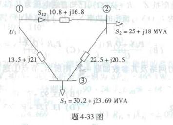 有一环网及其参数如题4-33图所示,节点①为电源,则该环网的功率分点及其功率的分开值为()。 (A)节点②15+j12,10+j6
