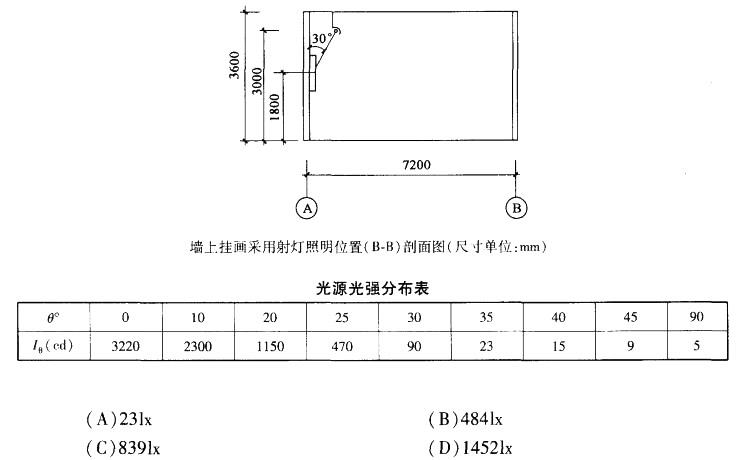 某办公室平面长14.4m、宽7.2m、高3.6m,墙厚0.2m(照明计算平面按长14.2m、宽7.0m),工作面高度为0.75m,平面图如下图所示,办公室中均匀布置荧光灯具。 若该办公室墙面上有一幅挂画,画中心距地1.8m,采用一射灯对该画局部照明,灯具距地3m,光轴对准画中心,与墙面成30°角,位置示意如下图所示,射灯光源的光强分布如下表,试求该面中心点的垂直照度应为下列哪项数值?()