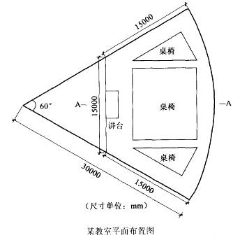 某教室平面为扇形面积减去三角形面积,扇形的圆心角为60°,布置见下图,圆弧形墙面的半径为30m,教室中均匀布置格栅荧光灯具,计算中忽略墙体面积。 若该教室顶棚高度3.6m,灯具嵌入顶棚安装,工作面高0.75m,该教室室空间比为下列哪一项数值?()