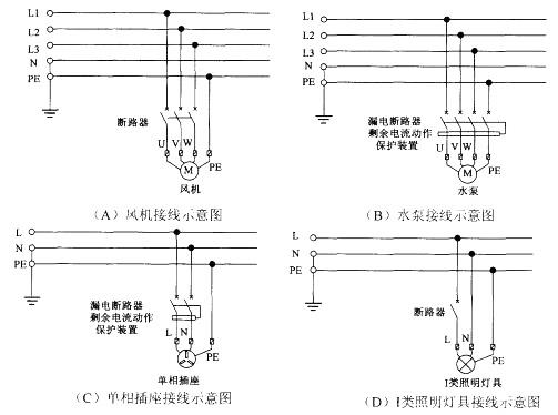 某办公楼供电电源10kV电网中性点为小电阻接地系统,双路10kV高压电缆进户,楼内10kV高压与低压电器装置共用接地网,请回答下列问题。 低压配电系统接地及安全保护采用TN-S方式,下列常用机电设备简单接线示意图中哪一项不符合规范的相关规定?