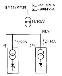 如右图所示,某工厂变电所35kV电源进行测(35kV电网)最大运行方式时短路容量650MV· A、最小运行方式时短路容量500MV· A,该变电所10kV母线皆有两组整流设备,整流器接线均为三相全控桥式。已知1号整流设备10kV侧5次谐波电流值为20 A,2号整流设备10kV侧5次谐波电流值30A。 请回答下列问题。 计算按照规范要求允许全部用户注入35kV电网公共连接点的5次谐波电流分量为下列哪一项?() (A)31.2A
