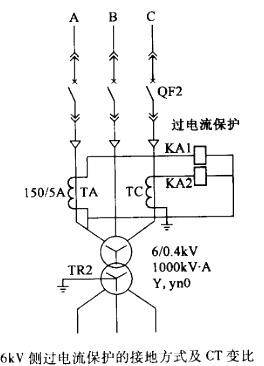 假设变压器TR2的绕组接线组别为Y,yn0,6kV侧过电流保护的接线方式及CT变比如下图所示。已知6kV侧过电流保护继电器KA1和KA2的动作整定值为15.3A。最小运行方式下变压器低压侧单相接地稳态短路电流为12.3kA。欲利用高压侧过电流保护兼作低压侧单相接地保护,其灵敏系数应为下列哪一项?()