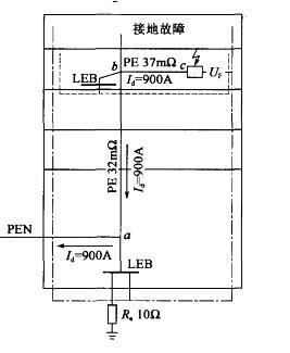 在一住宅单元楼内以单相220V、TN-C-S系统供电,单元楼内PE干线的阻抗值32mΩ,PE分支干线的阻抗值37mΩ,重复接地电阻值Ra为100,以及故障电流值Id为900A 如右图所不,在该楼层内做虚线所示的局部(辅助)等电位联结LE B,试求这种情况下用电设备C发生图示的碰外壳接地故障时,用电设备金属外壳上的预期接地电压值Uf是多少?()
