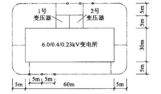 某变电所内设露天6/0.4kV变压器、室内6kV中压柜及0.4kV低压开关柜等设备,6kV系统为中性点不接地系统,低压釆用TN-S接地形式。已知条件:土壤电阻率ρ=100Ω?m,垂直接地体采用钢管,其直径d=50mm,长度L=2.5mm,水平接地体采用扁钢,其尺寸为40mmx4mm,见下图。