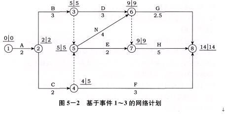 2.(1)由于工作N、F、G进度拖后属于可顺延工期的情况,因此,考虑事件1~3后形成的网络计划如图5—2所示: