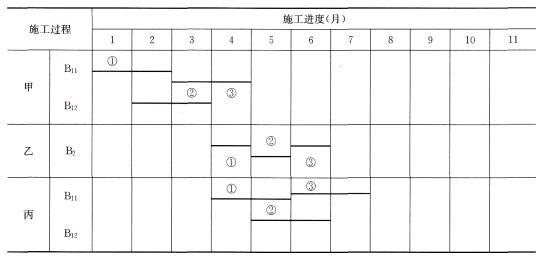 4.(1)B分部工程三个施工过程的流水节拍的最大公约数为1,流水步距为1个月;