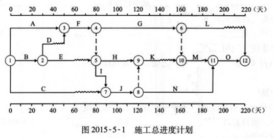 某工程,建设单位与施工单位签订了施工合同,合同工期为220天。经总监理工程师批准的施工总进度计划如图2015-5-1所示,各项工作均按最早开始时间安排且匀速施工。