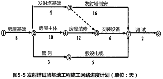 某施工单位(乙方)与某建设单位(甲方)签订了建造无线电发射试验基地施工合同。合同工期为38天。由于该项目急于投入使用,在合同中规定,工期每提前(或拖后)1天奖励(或罚款)5000元(含税费)。乙方按时提交了施工方案和施工网络进度计划(如图5-5所示),并得到甲方代表的批准。
