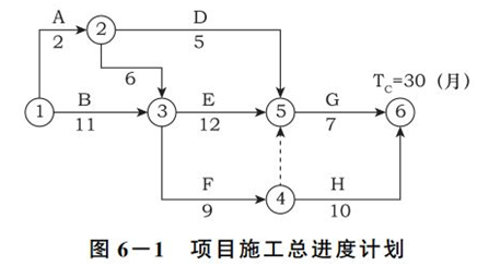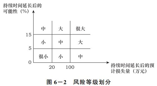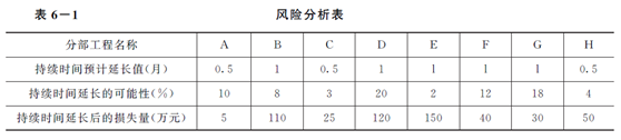 某工程,施工单位向项目监理机构提交了项目施工总进度计划(图6-1)和各分部工程的施工进度计划。项目监理机构建立了各分部工程的持续时间延长的风险等级划分图(图6-2)和风险分析表(表6-1),要求施工单位对风险等级在“大”和“很大”范围内的分部工程均要制定相应的风险预防措施。