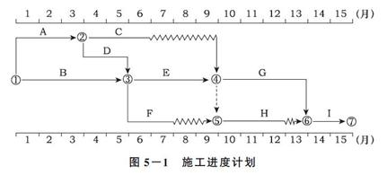 某实施监理的工程,合同工期15个月,总监理工程师批准的施工进度计划如图5-1所示。