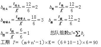 (1)m=6,t挖=12,t垫=12,t混凝土=18,t基=12,t回=6 (2)确定流水步距,K=流水节拍的最大公约数,K=6 (3)确定各施工过程需要的作业队组数