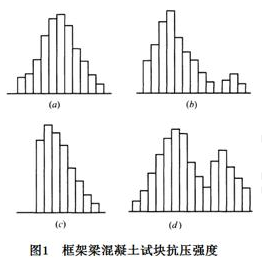 事件3:项目监理机构进行框架梁混凝土试块抗压强度数据统计分析,不同部位统计时出现了如图1所示的四种分布的直方图。