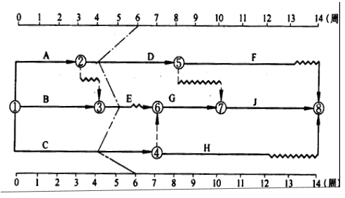 某工程项目时标网络计划如图所示。该计划执行到第6周末检查实际进度时,发现工作A和B已经全部完成,工作D、E分别完成计划任务量的20%、50%,工作C尚需3周完成,试用前锋线法进行实际进度与计划进度的比较。