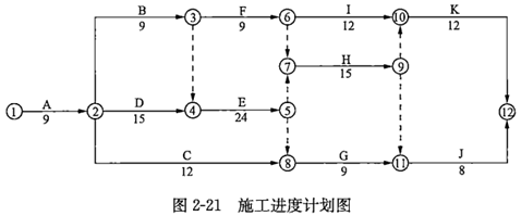 3.针对图2-21所示的施工进度计划,确定该施工进度的工期和关键工作。并分别计算C工作、D工作、F工作的总时差和自由时差。