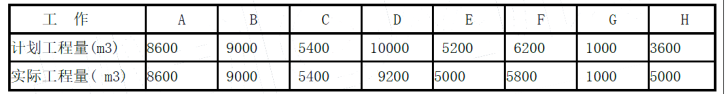 该项目的各项工作均按最早开始时间安排,且各工作每月所完成的工程量相等。各工作的计划工程量和实际工程量如工程量表所示。工作D、E、F的实际工作持续时间与计划工作持续时间相同。