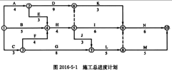 1、确定图5-1施工总进度计划的总工期及关键工作,计算工作G的总时差。