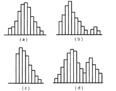 事件2:项目监理机构进行框架梁混凝土试块抗压强度数据统计分析,不同部位统计时出现了如图1所示的四种分布的直方图。