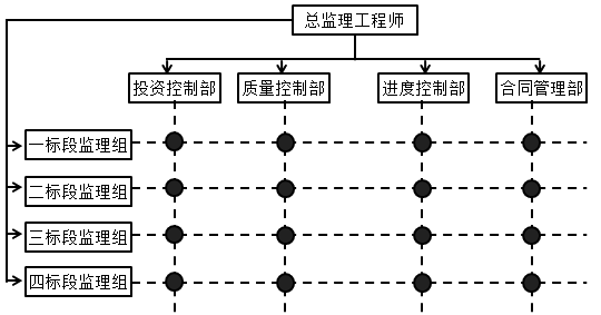 一、二标段工程开工半年后,三、四标段工程相继准备开工,为适应整个项目监理工作的需要,总监理工程师决定修改监理规划,调整项目监理机构组织形式,按四个标段分别设置监理组,增设投资控制部、进度控制部、质量控制部和合同管理部四个职能部门,以加强各职能部门的横向联系,使上下、左右集权与分权实行最优的结合。