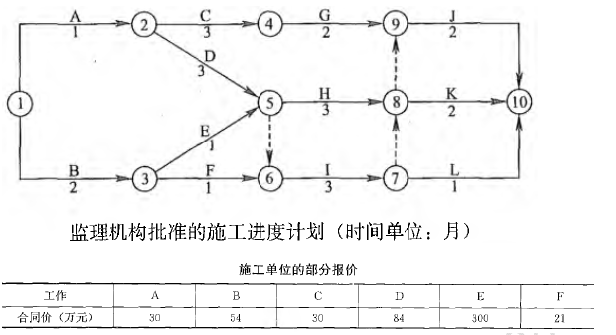1.答:该施工进度计划中的关键线路有4 条: A→D→H→K(或①→②→⑤→⑧→⑩); A→D→H→J(或①→②→⑤→⑧→⑨→⑩); A→D→I→K(或①→②→⑤→⑥→⑦→⑧→⑩); A→D→I→J(或①→②→⑤→⑥→⑦→⑧→⑨→⑩)。 2.答:E 自由时差为1 个月;E 总时差为1 个月;F 自由时差为1 个月;F 总时差为1 个月;G 自由时差为1 个月;G 总时差为1 个月。 3.答:开工后前3 个月,施工单位每月应获得的工程款为: 第1 个月:30+54/2=57 万元; 第2 个月:54/2+30/3+84/3=65 万元; 第3 个月:30/3+84/3+300+21=359 万元。 4.答: (1)工程预付款为:840×20%=168 万元。 (2)开工前3 个月施工单位累计应获得的工程款:57+65+359=481 万元>840×50%=420 万元。 因此,预付款应从第3 个月开始扣回。 (3)开工后前3 个月总监理工程师每月应签发的实际进度款为: 第1 个月:57—57×10%=51.3 万元(或57×90%=51.3 万元)。 第2 个月:65—65×10%=58.5 万元(或65×90%=58.5 万元)。 前2 个月扣留保修金:(57+65)×10%=12.2 万元。 应扣保修金总额:840×3%=25.2 万元。 由于359×10%=35.9 万元>25.5—12.2=13 万元。 第3 个月应签发的工程款:359—13—168/3=290 万元。 5.答:施工单位要求的判断和理由如下: (1)事件1 中,施工单位提出的费用要求不合理。 理由:施工自检费用属于建筑安装工程费中的措施费(或该。费 用已包含在合同价中) 6.答:监理机构不应批准施工单位提出的工期补偿1 个月的要求, 理由:建设单位要求调整场地标高,设计单位修改施工图,致使B 工作开始时间推迟1 个月,但是B 工作有总时差1 个月,不影响工期,故不应批准。 监理机构应批准施工单位提出的费用补偿10 万元的要求 理由:由于非施工单位的原因造成的损失,故应该批准。