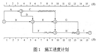 某工程,建设单位与施工单位签订了施工合同,合同工期15个月。经总监理工程师批准的施工总进度计划如图1所示,各项工作均按最早开始时间安排且匀速施工。