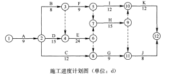 3.针对上图所示的施工进度计划,确定该施工进度计划的工期和关键工作。并分别计算C工作、D工作、F工作的总时差和自由时差。