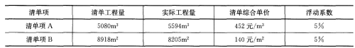 在总承包施工合同中约定“当工程量偏差超出5%时,该项增加部分或剩余部分的综合单价按5%进行浮动”。施工单位编制竣工结算时发现工程量清单中两个清单项的工程数量增减幅度超出5%,其相应工程数量、单价等数据详见下表: