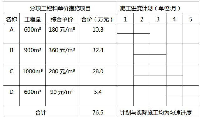 某工程项目发包人与承包人签订了施工合同,工期5个月。分项工程和单价措施项目的造价数据与经批准的施工进度计划如表5.1所示;总价措施项目费用9万元(其中含安全文明施工费3万元);暂列金额12万元。管理费和利润为人材机费用之和的15%。规费和税金为人材机费用与管理费、利润之和的10%。