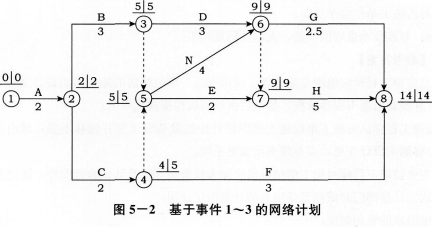 2.(1)由于工作N、F、G进度拖后属于可顺延工期的情况,因此,考虑事件1~3后形成的网络计划如图5—2所示: