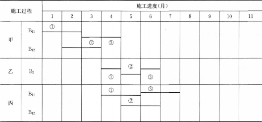 4.B分部工程组织加快的成倍节拍流水施工后,流水步距为多少个月甲、乙、丙施工过程应分别安排几个工作队B分部工程的流水施工工期为多少个月绘制B分部工程调整的流水施工进度计划横道图。