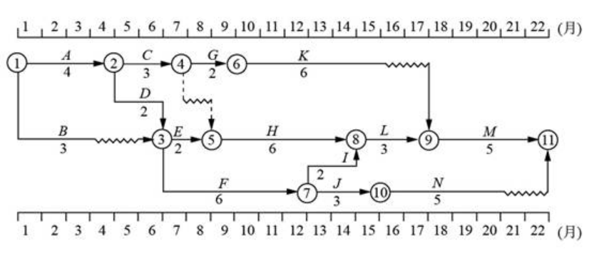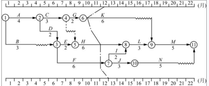 (2)由图可知,关键线路为:A→D→E→H→L→M,A→D→F→I→L→M。工作H(F)为关键工作且其工期拖后1个月,因此总工期将延长1个月。