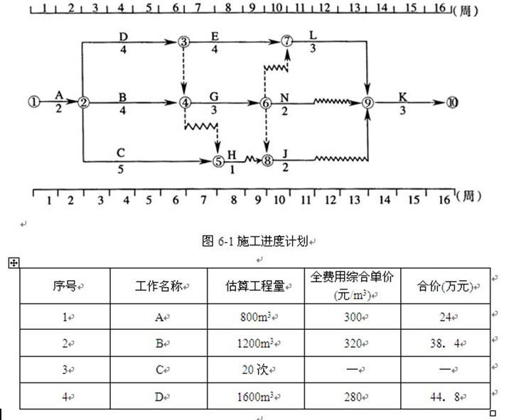 某工程的施工合同工期为16周,项目监理机构批准的施工进度计划如图6—1所示(时间单位:周)。各工作均按匀速施工。施工单位的报价单(部分)见表6—1.