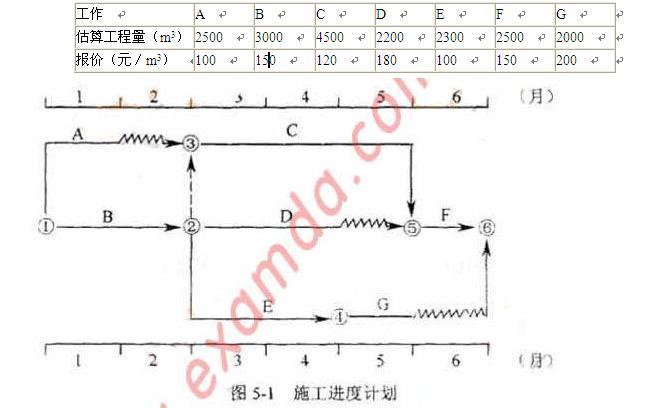 某工程,建设单位与施工单位按照《建设工程施工合同(示范文本)》签订了施工承包合同。合同约定:工期6个月;A、B工作所用的材料由建设单位采购;合同价款采用以直接费为计算基础的全费用综合单价计价;施工期间若遇物价上涨,只对钢材、水泥和骨料的价格进行调整,调整依据为工程造价管理部门公布的材料价格指数。招标文件中工程量清单所列各项工作的估算工程量和施工单位的报价如表5-1所示,该工程的各项工作按最早开始时间安排,按月匀速施工,经总监理工程师批准的施工进度计划如图5-1所示。