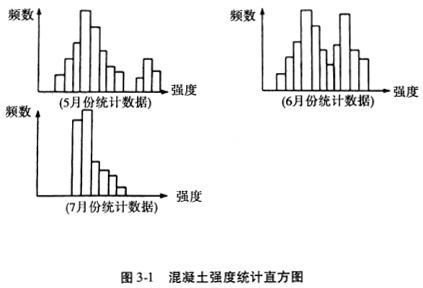 事件3:B、C两个标段5、6、7三个月混凝土试块抗压强度统计数据直方图如图3-1所示: