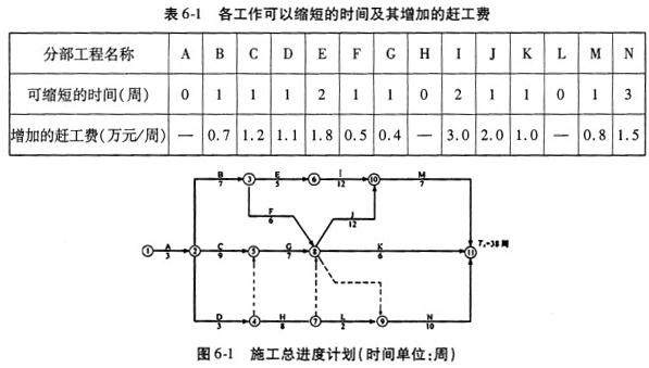 某市政工程,项目的合同工期为38周。经总监理工程师批准的施工总进度计划如图6-1所示,各工作可以缩短的时间及其增加的赶工费如表6-1所示,其中H、L分别为道路的路基、路面工程。