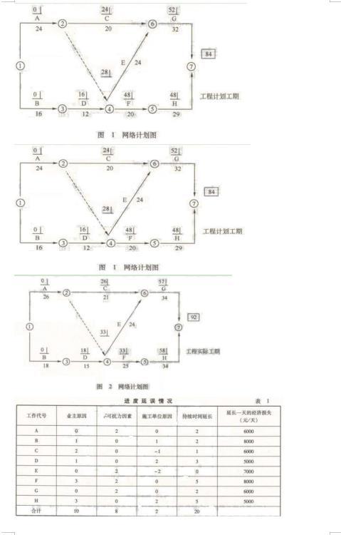 某工程建设项目的施工计划如图所示。在施工过程中,由于业主原因、不可抗力因素和承包人原因对各项工程的持续时间产生了一定的影响,其进度延误情况如表所示(正数为延长工作天数,负数为缩短工作天数)。网络计划的计划工期为84天。由于工作时间延误,网络计划的实际工期为92天,如图2所示。为此,承包人依据合同约定,就业主原因和不可抗力因素造成的延误提出延长合同工期18天,或至少按实际工期的延误延长合同工期8天。同时,承包人还就工期延误造成的经济损失提出费用索赔11.8万。