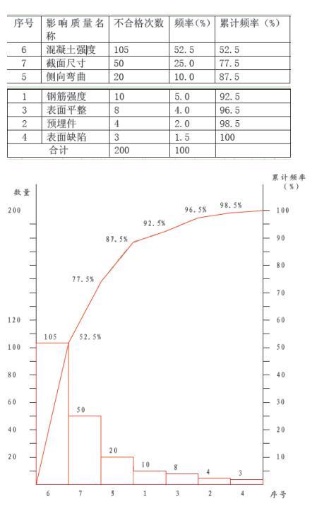 (2)分析主要、次要和一般因素。①列表统计出各项频率和累计频率。②影响质量的主要因素有混凝土的强度和截面尺寸;次要因素有:侧向弯曲;一般因素有钢筋强度、表面平整、预埋件和表面缺陷。③画出排列图,如图所示。④处理意见:监理工程师应要求承包商提出具体的质量改进方案,分析产生质量问题的原因,制定具体的措施提交监理工程师审查,经监理工程师审查确认后,由施工单位实施改进。执行过程中,监理工程师应严格控制。