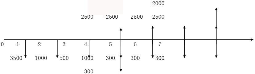 某工程项目进行可行性研究,设计投资为5000万元,计划3年完成,第一年完成3500万元,第二年完成1000万元,第三年完成500万元,第三年末投入运营,估算运营后每年的管理养护费用为300万元,年征收过路费2500万元,第四年为完善各种设施,需增加投资1000万元,若计算期为七年,基准收益率10%,残值为2000万元,具体见下表。 【问题】(1)请画出该项目的现金流量图;