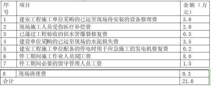 2、(1)建设单位承担的经济损失:①.待安装的设备修理费;②.供水管爆裂修复费;③.水泥损失费;④.留守管理人员工资;⑤.现场清理费;施工单位承担的经济损失为:①现场施工人员受伤医疗补偿费;②应急发电机修复费;③施工作业人员窝工费;(2)费用补偿总额:5+0.5+1.5+0.3=7.3(万元);(3)工程延期要求成立。