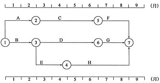 梁板混凝土施工时标网络图该工程项目的各项工作均按最早开始时间安排,且各工作每月所完成的工程量相等。各工作的计划工程量和实际工程量如表4-3所示。工作D、E、F的实际持续时间与计划持续时间相等。