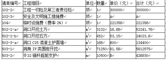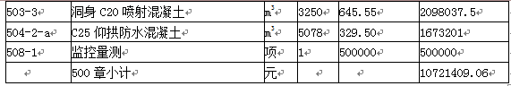 施工结束时,实际完成的“503-2”工程量为12500m,“503-3”工程量为增加了“洞口C25喷射混凝土”115m3。