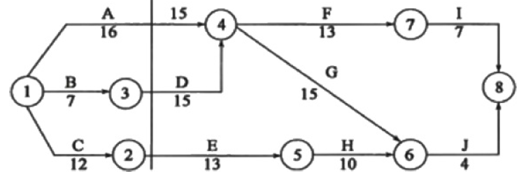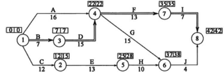 计算下面网络图的时间参数,确定关键线路。按此计划施工,15天后检查计划执行情况,发现A工作还需4天,D工作还需8天,E工作还需10天。照这样下去,工程能否按时完工?如不能,应如何调整?