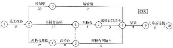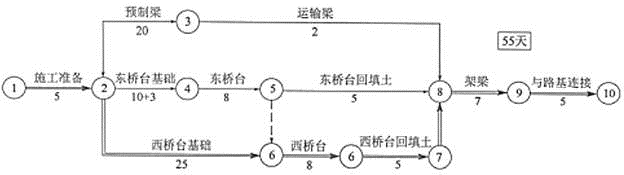 在桥台的施工模板仅有一套的条件下,合理组织施工。因为西侧桥台基础为桩基,施工时间长(25天),而东侧桥台为扩大基础,施工时间短(10天),故应将原施工网络计划中西侧桥台和东侧桥台基础施工完毕后再施工东侧桥台的施工组织方案改为在东侧桥台和西侧桥台基础施工完毕后,再组织施工西侧桥台,这样改变一下施工组织方式,可以将该施工网络计划的计划工期缩短到55天,小于要求工期60天,也不需要增加费用。调整后的网络计划图如图3-2所示。
