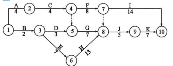 某公路工程项目分项工程网络图如下,第12天晚上检查时发现F、G、H工序分别还需3天、6天、12天才能完成。