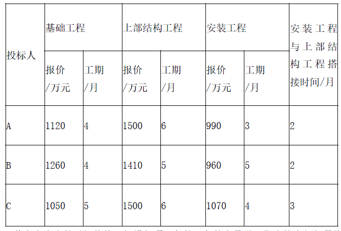 事件1:招标文件规定,工期不得长于12个月,若投标人自报工期少于12个月,在评标时将考虑其给招标人带来每月20万元的收益。投标人A、B、C的投标报价和工期有关的数据汇总见下表。